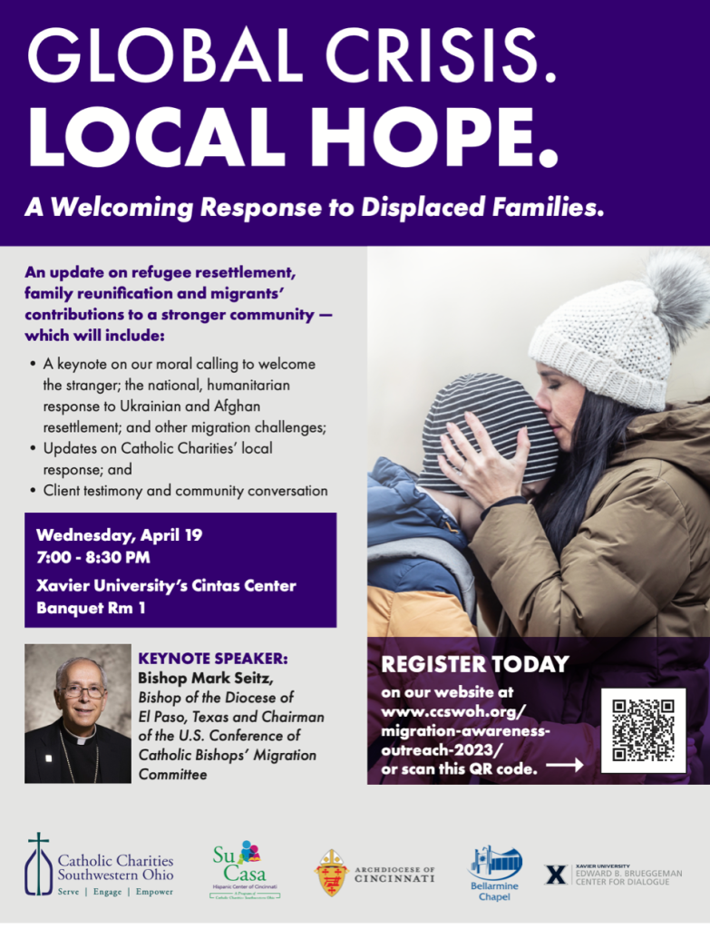 Catholic Bishop Mark Seitz of El Paso to speak in Cincinnati on welcoming refugee families: Catholic Charities of Southwest Ohio will give updates on refugee resettlement in Ohio, and refugees will share their experiences. Bishop Seitz chairs the U.S. Conference of Catholic Bishops’ Migration Committee. This is an in-person event at Xavier University’s Cintas Center. RSVP here.