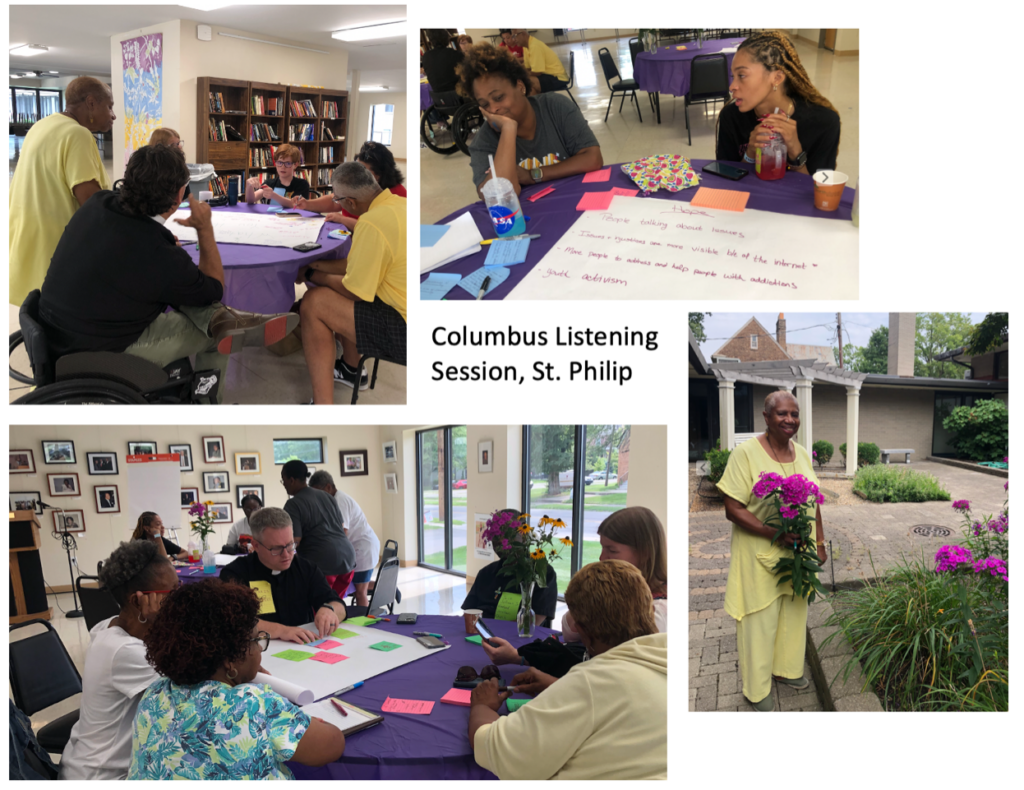 Undeterred by conflicting events including get-out-the-vote, poll worker training, a festival in Dublin, and the Ohio State Fair, Episcopalians from six Central Ohio congregations gathered August 5 at St. Philip’s, Columbus, to share their views with each other and this reporter on what they most want their elected officials to know about the communities they serve, their top concerns, and what gives them hope. At tables graced by bouquets from the St. Philip memorial garden, we brainstormed in small groups, making a collage of colorful post-its and writing directly on huge sheets of paper, then flocked to the table to fill our plates with delicious choices from a classic church pot luck supper.