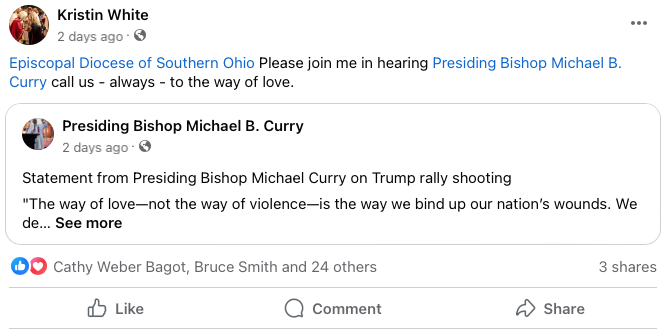 Bishop Kristin Uffelman White immediately posted Presiding Bishop Michael Curry’s response on Facebook: “The way of love—not the way of violence—is the way we bind up our nation’s wounds. We decry political violence in any form, and our call as followers of Jesus of Nazareth is always to love. We pray for the families of those who were killed. We pray for former President Trump and his family and for all who were harmed or impacted by this incident. I pray that we as a nation and a world may see each other as the beloved children of God.”