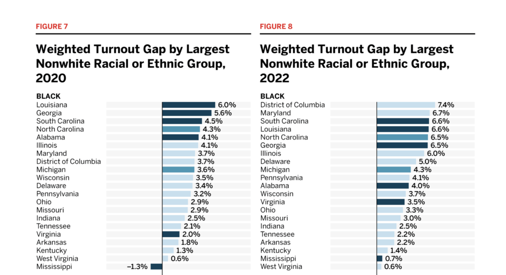 “We show that the racial turnout gap has grown everywhere,” the Brennan Center researchers add. “In all regions, the gap in the 2022 midterms was larger than in any midterm since at least 2006… That gap costs American democracy millions of ballots that go uncast by eligible voters.