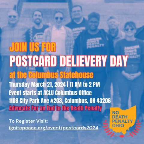 The quest to end the death penalty has bipartisan support and is a top priority of the Ohio Council of Churches this year. On Thursday, March 21, advocates are meeting at the ACLU Columbus office, 1108 City Park Avenue #203, at 11 a.m. and will deliver 1,500 handwritten postcards to Ohio legislators. Register here. “We’ll start the day getting to know one another better at the ACLU office, get a small training on how to deliver the cards, enjoy a provided lunch and then head to the statehouse together to deliver the postcards,” writes No Death Penalty Coalition member Bekky Baker, MSW, Program Director of Ignite Peace in Cincinnati. “There will be a few visitor spots open in the ACLU parking lot and there is free street parking on the surrounding streets – City Park Ave, Mithoff St., Thurman Ave.”