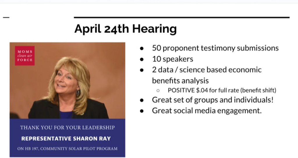 If you live near Columbus and support this bill, please plan to attend the hearing to show support. The coalition supporting the bill is meeting at 10:15 in the Statehouse Rotunda and will hand out yellow community solar t-shirts. Supporters will not be speaking but are invited to encourage the committee members with tweets during the hearing. This was very successful at the April 24 hearing. Here is the social media strategy with handles for key coalition partners and reporters.