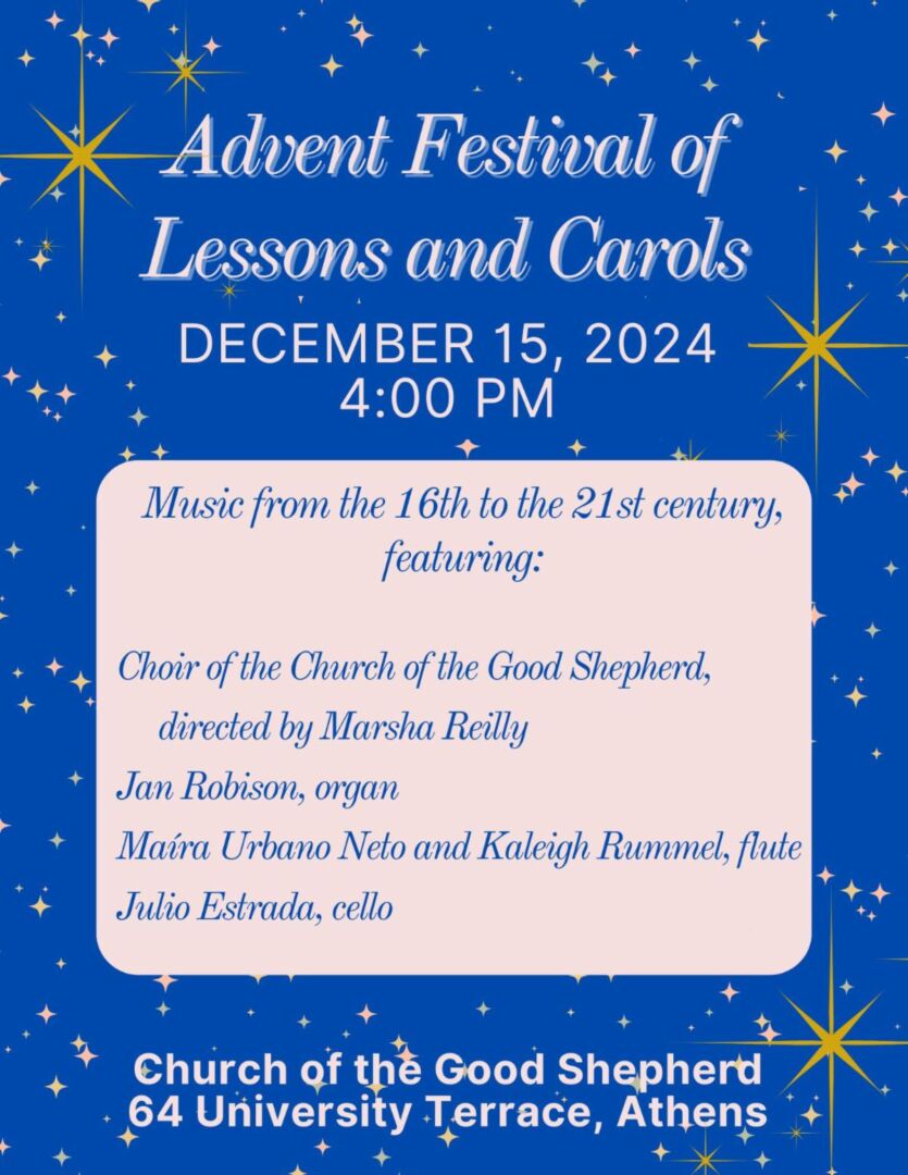 The Church of the Good Shepherd, Athens, offers an Advent Festival of Lessons and Carols on Sunday, December 15 at 4 pm. Music from the 16th to 21st century, featuring the choir of the Church of the Good Shepherd, directed by Marsha Reilly. Jan Robison, organ, Maira Urbano Neto and Kaleigh Rommel, flute, and Julio …