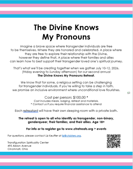 July 10 – 12, 2026 at Transfiguration Spirituality Center in Glendale, OH Douglas Argue and Alejandro Rodriguez, facilitating Imagine a brave space where transgender individuals are free to be themselves. Where they are honored and celebrated. A place where they are free to explore their relationship with the Divine, however they define that. A place …