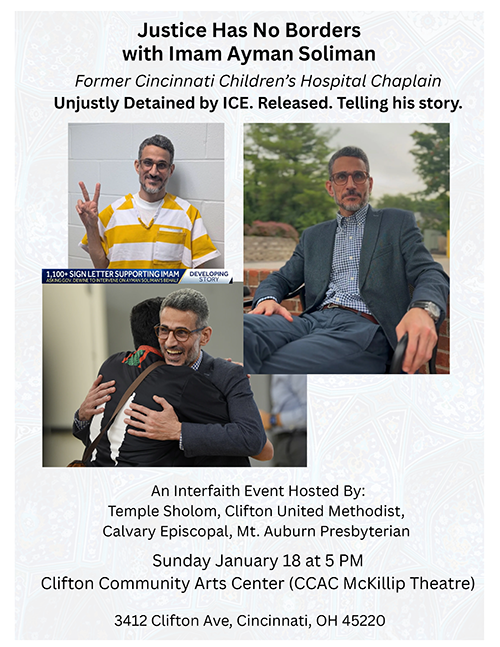 Imam Ayman Soliman, a former Cincinnati Children's Hospital chaplain unjustly detained by ICE the released, shares his story of hope. This interfaith event is sponsored by Temple Shalom, Clifton United Methodist Church, Calvary Episcopal Church and Mt. Auburn Presbyterian Church. Download the flyer |