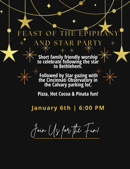 Join with the congregation of Calvary, Clifton, for a short family-friendly worship service to celebrate following the star to Bethlehem, followed by star gazing with the Cincinnati Observatory in the parking lot of the church. Also - pizza, hot cocoa and pinatas!