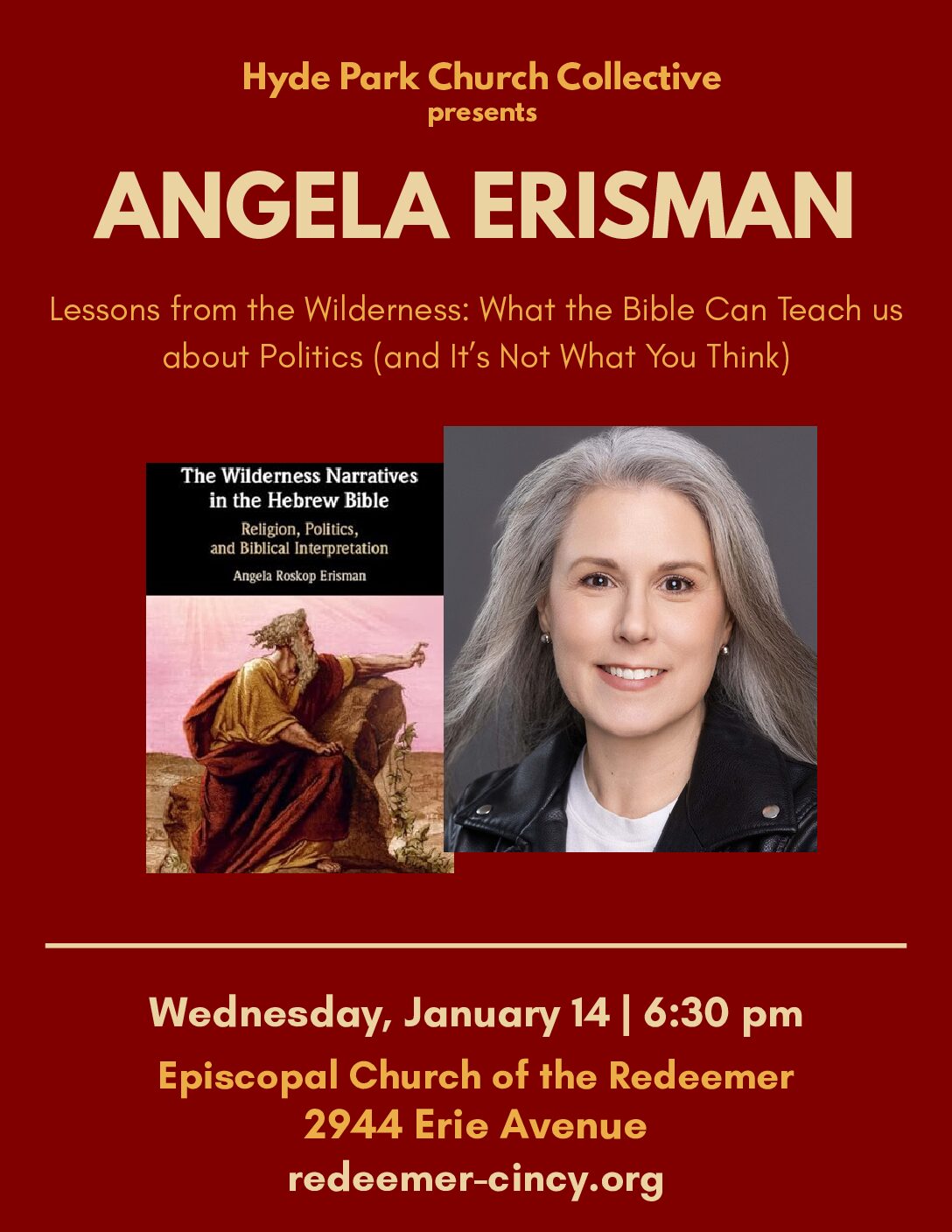 Hyde Park Church Collective Presents: Lessons from the Wilderness: What the Bible Can Teach us about Politics (and It’s Not What You Think) with author, Angela Rockop Erisman. Join us on Wednesday, January 14 at 6:30 pm in the Sanctuary at Church of the Redeemer, Hyde Park. Angela Roskop Erisman is an independent scholar of … |