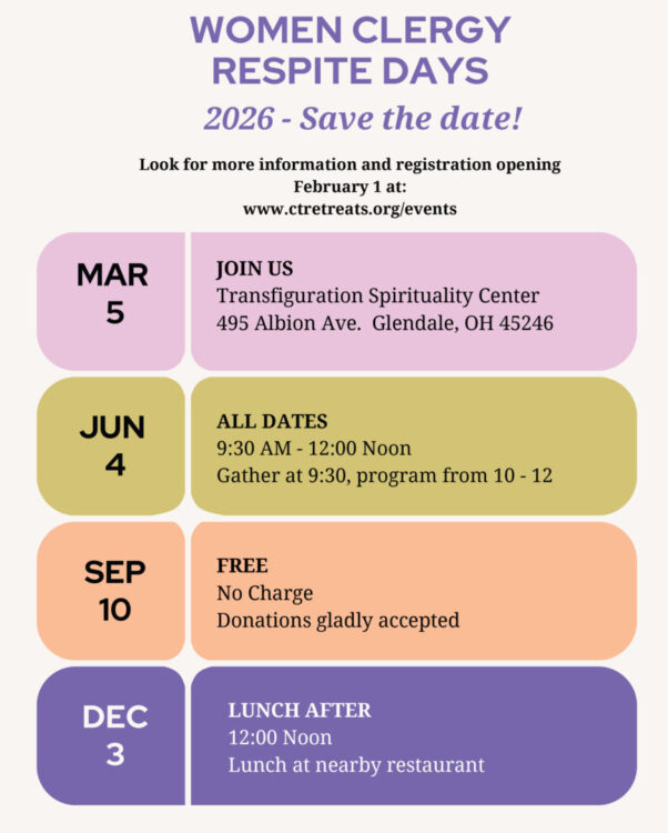 Transfiguration Spirituality Center (TSC) is excited to present four morning gatherings specifically for women clergy this year! As women clergy and faith-leaders, we will gather for mutual support, encouragement, and … |