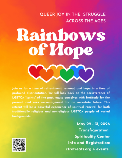 May 29 – 31, 2026 at Transfiguration Spirituality Center in Glendale, OH The Rev. Charles Graves, IV, facilitating Join TSC for a time of refreshment, renewal, and hope in a time of profound disorientation. We will look back on the perseverance of LGBTQ+ “saints” of the past, equip ourselves with fortitude for the present, and … |