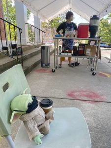 So right now, campus ministry at Good Shepherd means a good cup of coffee at a fair price, a mask when you need it, a friendly face on the porch and, Woolsey hopes, an introduction to the religion and the life of faith. “There are many expressions of it and this is ours,” she said. “And not today or tomorrow or next year, but some day you may feel ‘I need this in my life.’ And I want you to remember the church with the funky shield with the red cross and the blue field with white crosses.” And maybe a blue TARDIS in the yard, and baby Yoda on the porch.