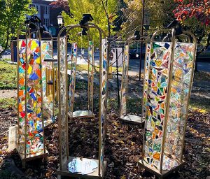 The church also has created the only memorial in Athens County to those lost in the pandemic. Pieces of broken stained glass are suspended inside a pair of facing metal arches perhaps five feet high, signifying, Woolsey said, the many people who died alone during the pandemic, and the ways in which the experience has left everyone broken in some way. A mirror at the bottom of each arch allows viewers to see themselves as part of the memorial. And as deaths in the United States passed one million, Woolsey said the parish hopes to find the money to make additional memorials.