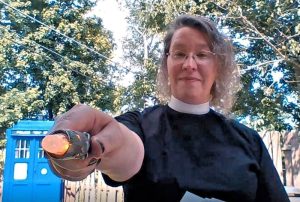Woolsey also turned to popular culture in 2018 when she offered a series called “The Gospel according to Doctor Who,” the time-traveling lord of the popular BBC series. She even had a full-sized TARDIS—the police box structure that permits travel through time and space, built on the church lawn. During the pandemic Woolsey moved it to her back yard, where it was featured in a series of videos called “TARDIS Talks” posted to the church’s YouTube channel.