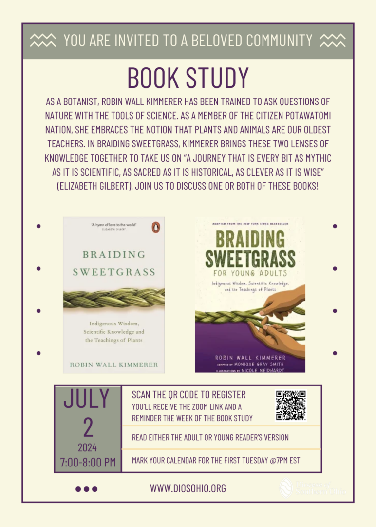 The July Beloved Community book study will be “Braiding Sweetgrass,” by Robin Wall Kimmerer. You can read either the adult or young readers version.