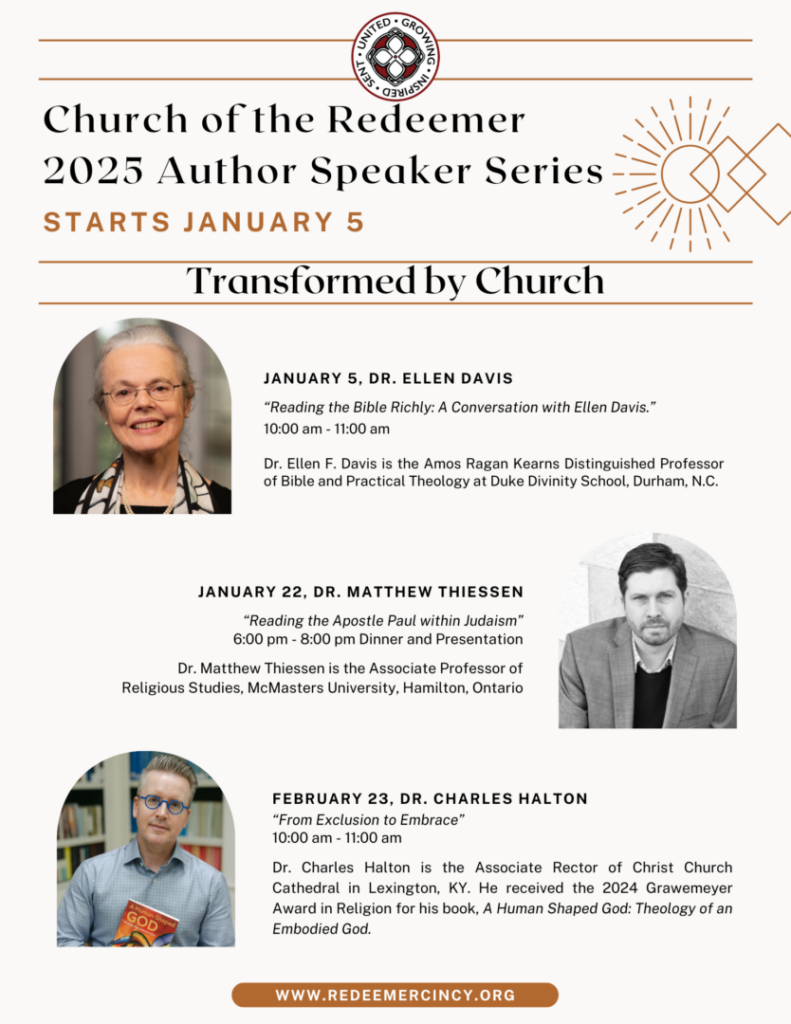 Join Church of the Redeemer on Wednesday, January 22 from 6:00 pm – 8:00 pm for dinner and the presentation “Reading the Apostle Paul within Judaism,” from our 2025 Author Speaker Series.