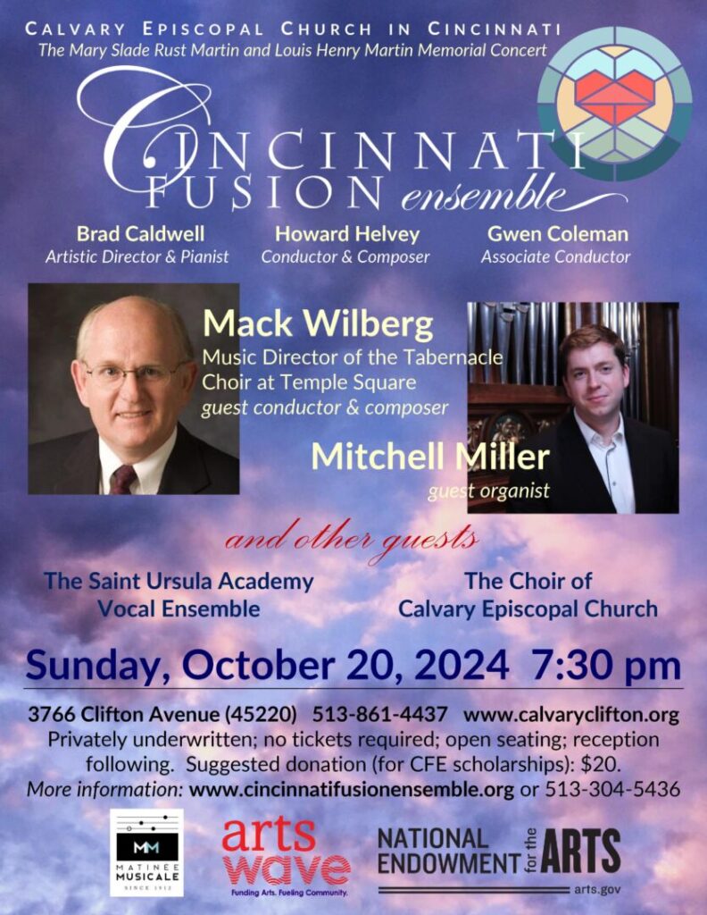 Calvary Church and the Cincinnati Fusion Ensemble cordially invite you to the annual Mary Slade Rust Martin and Louis Henry Martin Memorial Concert on Sunday, October 20, 7:30 PM. CFE is honored to again collaborate with internationally-acclaimed conductor and composer, Dr. Mack Wilberg (Music Director of the Tabernacle Choir at Temple Square). And we look forward to welcoming back, as guest organist, longtime friend of Calvary Church and CFE, Mitchell Miller. A reception will follow.