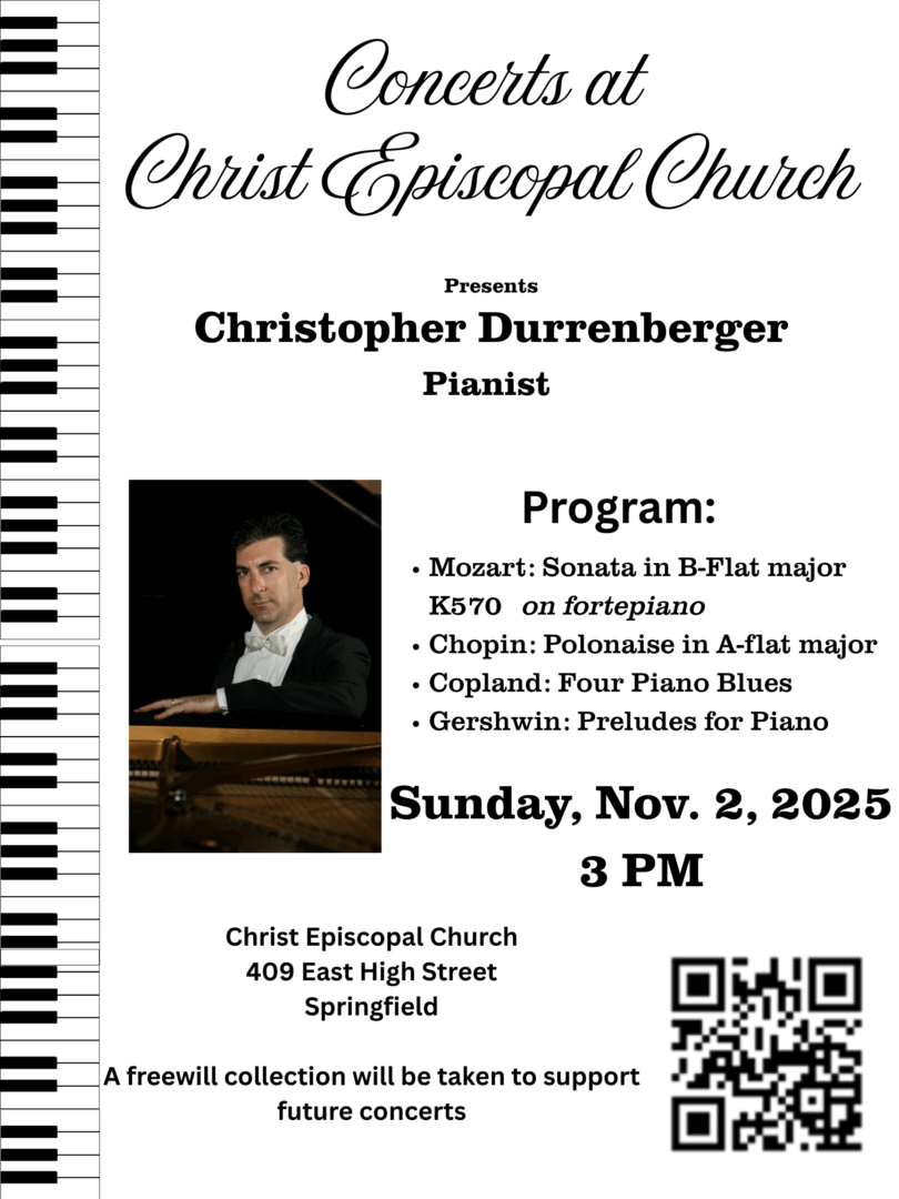 Concerts at Christ Church (Springfield) presents a concert with Christopher Durrenberger, pianist, on Saturday, November 2 at 3 pm.