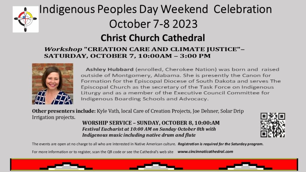 The Native American Ministries Council of Christ Church Cathedral will hold its annual Indigenous Persons’ weekend Celebration and Festival Eucharist Oct 7-8. This year’s theme focuses on Creation Care and Environmental Justice. The weekend will include a workshop on Saturday, October 7, led by Ashley Hubbard; and a Festival Eucharist at 10 a.m. on Sunday, October 8 with Indigenous music including native drum and flute. All are welcome and encouraged to attend both events. There is no charge for the workshop, but reservations are requested to plan for lunch. More details here.