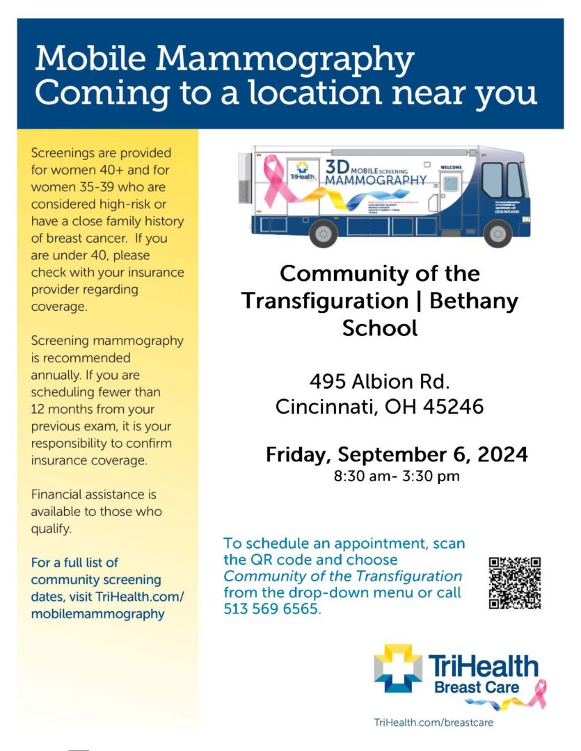 The Community of the Transfiguration will host the TriHealth mobile mammography van on Friday, September 6. Appointments are available from 8:30 a.m. to 3:30 p.m.