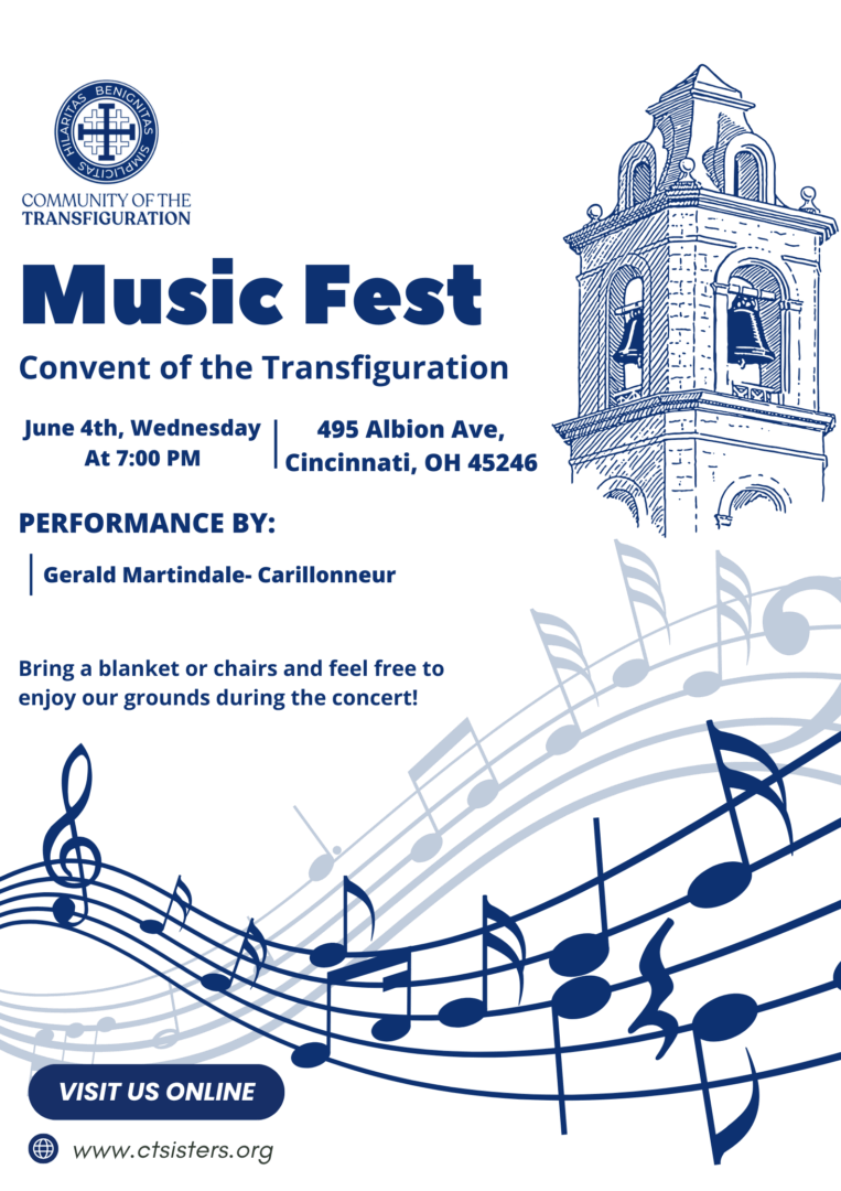 The Convent of the Transfiguration will host Music Fest, a free concert of carillion music on Wednesday, June 4 at 7 pm. Bring a blanket or chairs and enjoy the music of Gerald Martindale, carillonneur.