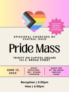 Columbus Pride Mass at Trinity on Capitol Square. Reception begins at 5:30 p.m.; service is at 6:30 p.m.