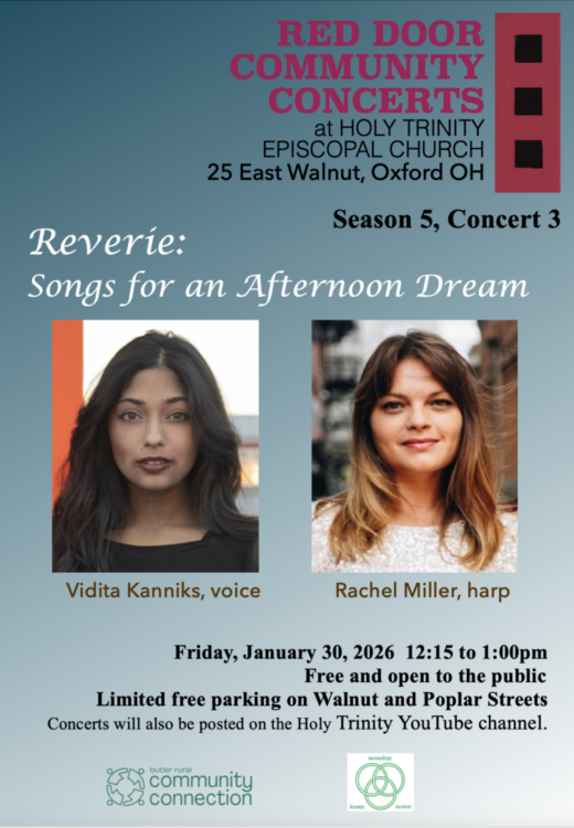 The next Red Door Community Concert at Holy Trinity, Oxford features singer Vidita Kanniks and harpist Rachel Miller. Drawing together sounds from various traditions of the world, including French Art Song, Celtic Folk Song and Hindustani Classical Music, their music weaves a colorful tapestry of languages, musical idioms and the ways they interact and play with each other – a lovely beginning to the afternoon.