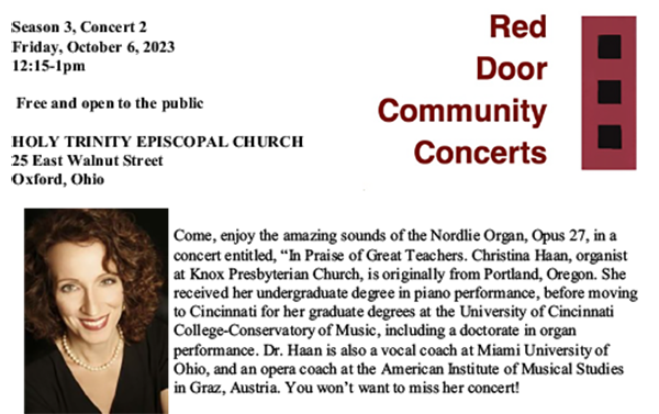 Holy Trinity, Oxford, will host its next Red Door Community Concert on Friday, October 6 at 12:15 p.m. Dr. Christina Haan will perform “In Praise of Great Teachers” on the the Nordlie Opus 27 organ. Haan, the organist at Knox Presbyterian Church, is also a vocal coach at Miami University and an opera coach at the American Institute of Musical Studies in Graz, Austria.