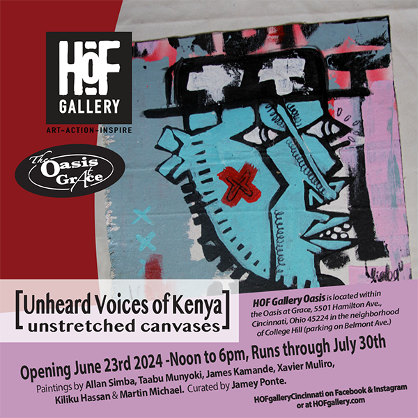 The House of Friends Oasis Gallery, located in Grace Church, Cincinnati, presents “Unheard Voices of Kenya: Unstretched Canvases,” an exhibit of paintings by Kenyan artists curated by Jamey Ponte, a member of the governing board at Grace Church. Jamey is an artist and activist who works part of the year in the Kibera Arts District in Nairobi, Kenya.
