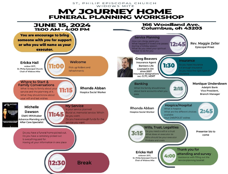 St. Philip, Columbus, Widows Mite will sponsor My Journey Home, a funeral planning workshop, on Saturday, June 28 from 9 am to 4 pm. You can come for part of …