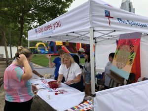 The industrial quality, 10 x 10 tents reside in the four areas of the diocese, Columbus, Cincinnati, Dayton and the East. They are branded with The Episcopal Church in Southern Ohio and the message, God loves you [no exceptions]. The back walls of the tents were intentionally left blank so that congregations can hang their own banners, signs, etc. We hope that congregations will think of new and creative ways to raise their visibility in their community at local festivals, concerts, farmers markets, etc.