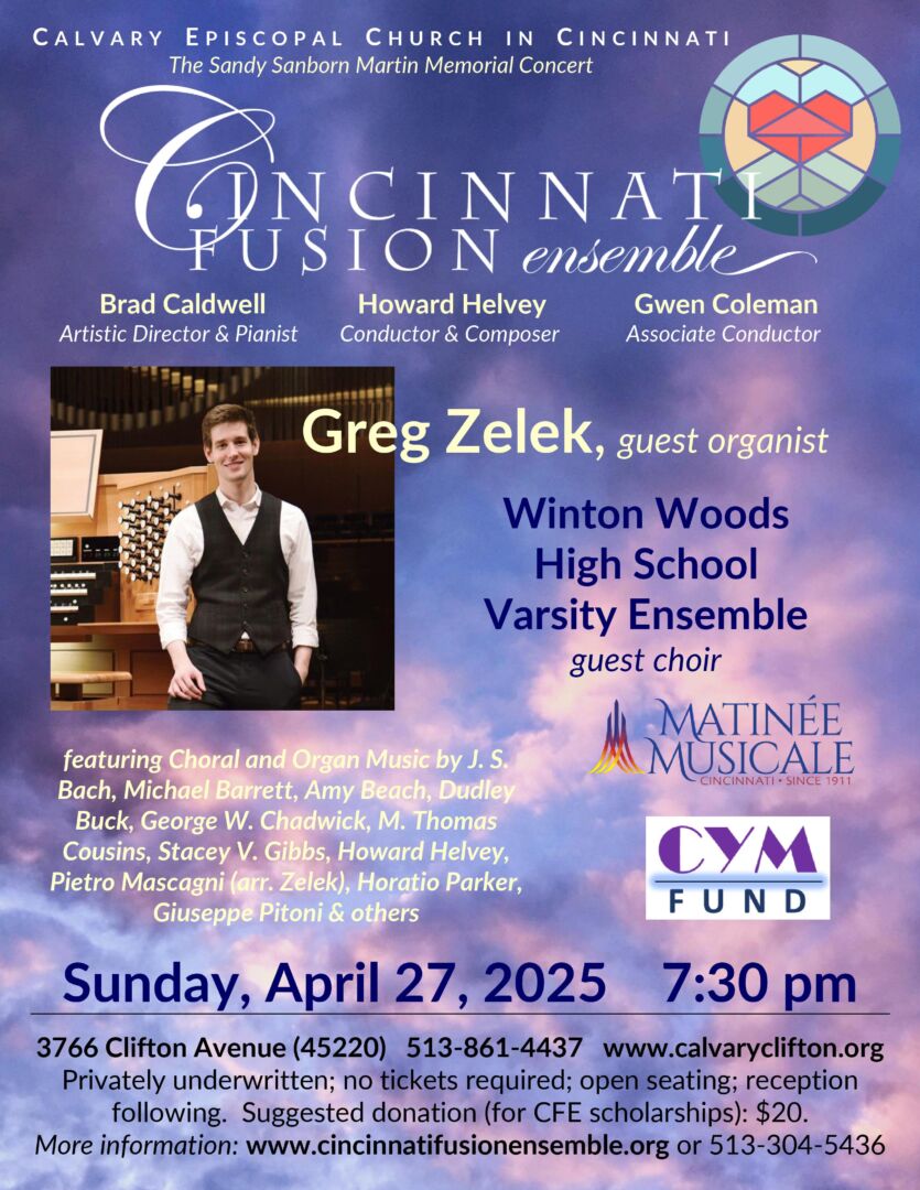 Calvary Episcopal Church in Cincinnati presents the Sandy Sanborn Martin Memorial Concert, featuring the Cincinnati Fusion Ensemble with international concert organist Greg Zelek, on Sunday, April 27 at 7:30 pm.   Howard Helvey, conductor & composer Brad Caldwell, artistic director & pianist Daniel Weeks, guest conductor The Winton Woods High School Varsity Ensemble, guest choir,