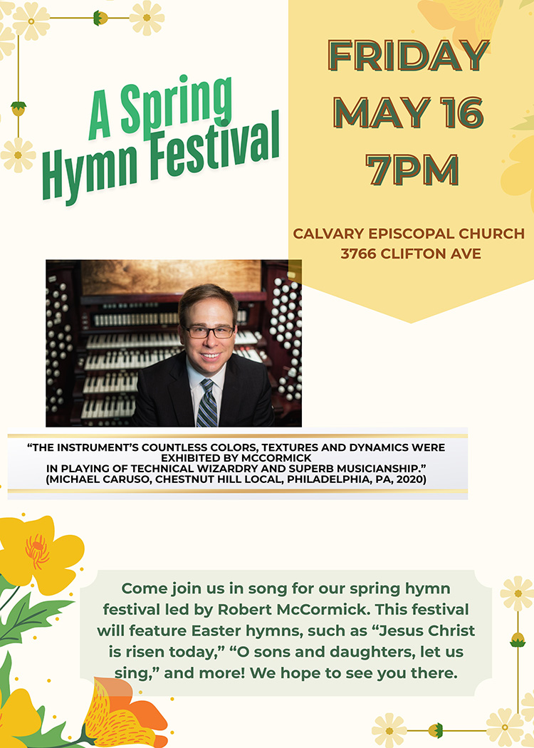 The American Guild of Organists will sponsor a Hymn Festival at Calvary, Cincinnati, at 7 pm. Led by Robert McCormick, the festival will feature Easter hymns, such as "Jesus Christ is risen today" and more.