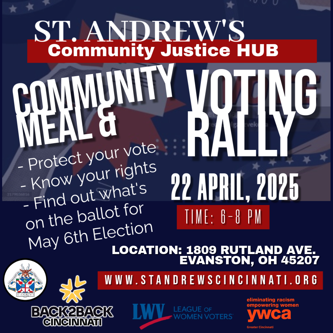 The Community Justice HUB at St. Andrew's, Evanston, will host a community meal and voting rally on Tuesday, April 22 from 6 to 8 p.m. The event is offered in collaboration with the League of Women Voters, the YWCA, and Back2Back Cincinnati, and will provide information on voting rights, protecting your vote, and what will