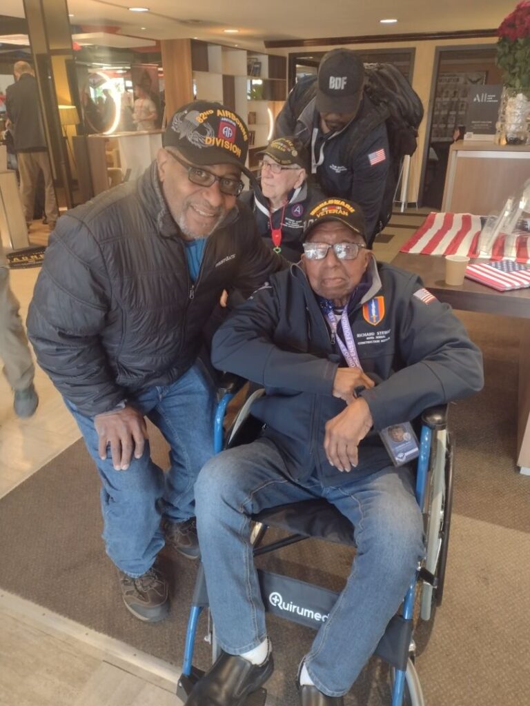Stewart and his son, Samuel, traveled to France on May 30 with a group of 45 veterans. He was one of three African Americans in the group, and, at 102, the oldest. Among those who gathered to wish Stewart well before his flight took off from Cincinnati was Vice Mayor Jan-Michele Lemon Kearney, who presented him with a proclamation declaring May 30, 2023 “Richard V. Stewart Day.”
