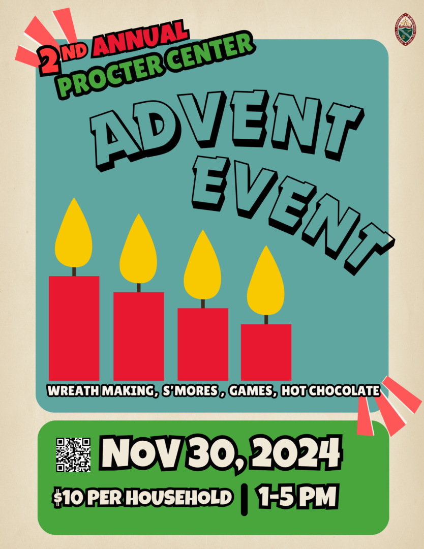 Join us in making advent wreaths using elements that can be forged in creation here at Procter! S’mores, Hot Chocolate, music and games are also part of this fun winter camp event for all ages. Parish carpools and caravans are encouraged!